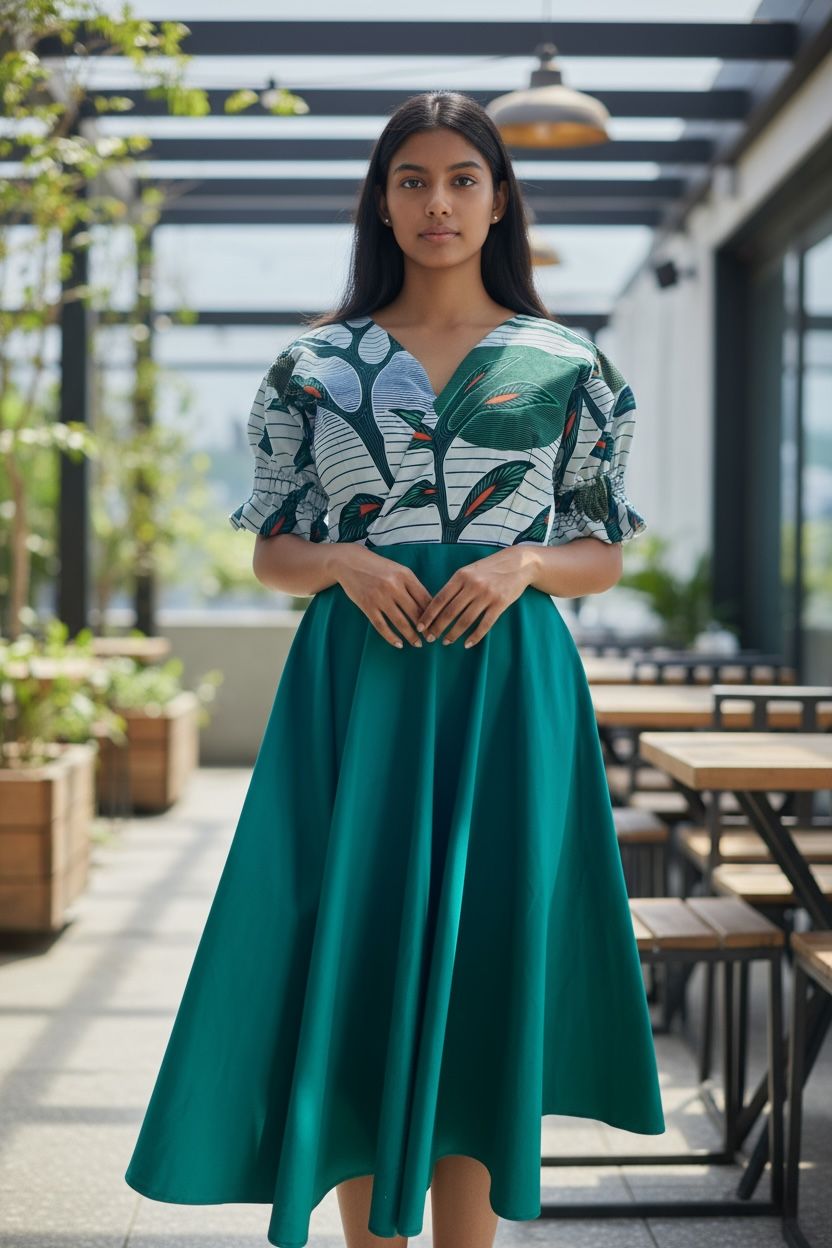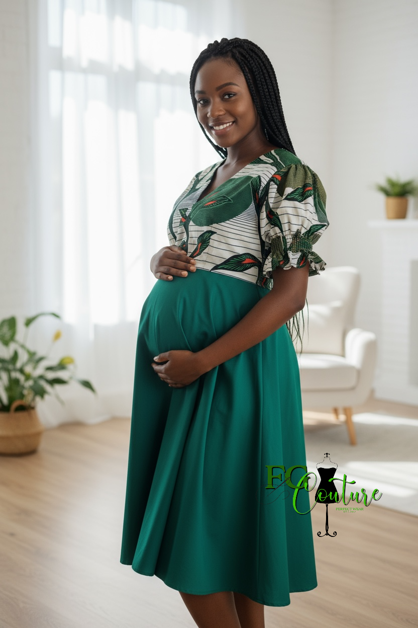 Perfect dress for wearing with just about any kind of shoe , high heels , flat sandals or trendy sneakers. The African print front lap top with flare bottom (skirt) dress can be used as a maternity dress because of the comfortable flare . The beautiful dress midi dress has a back zipper and unique puffed ruffled sleeves.